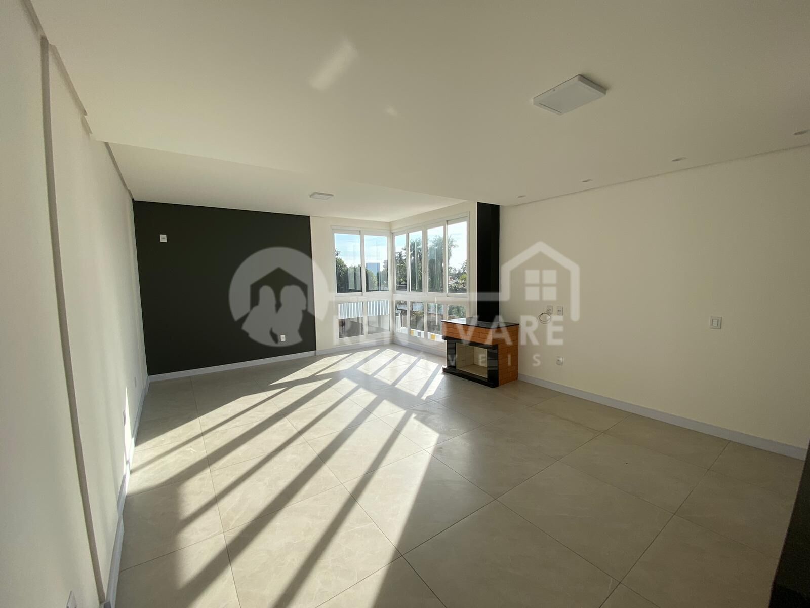 São três dormitórios sendo um suíte, lavabo, banheiro social, área de serviço, sala ampla com lareira e cozinha integrada com churrasqueira, interfone e garagem com duas vagas cobertas.